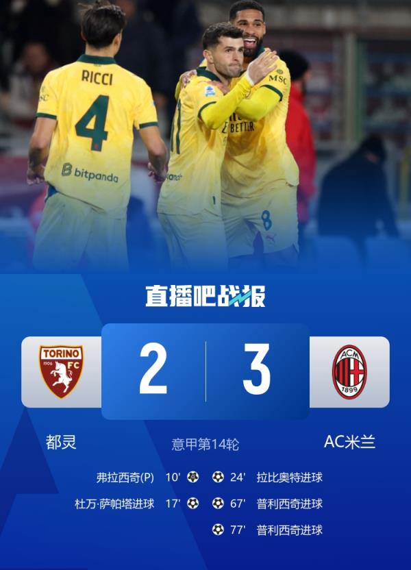 让二追三!米兰3-2都灵登顶榜首 普利西奇替补双响拉比奥特世界波