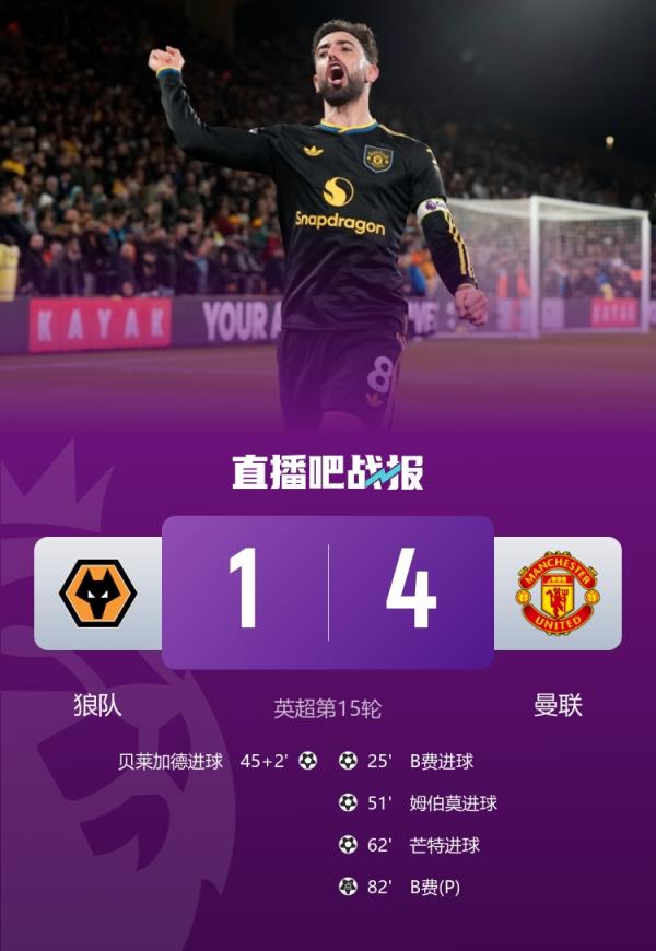 3轮不败升第6!曼联4-1狼队 B费2射1传姆伯莫芒特破门狼队15轮0胜