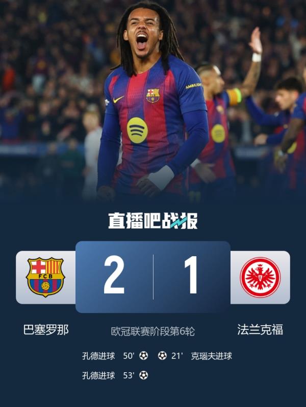 欧冠联赛阶段第6轮,巴萨2-1逆转法兰克福,孔德梅开二度。